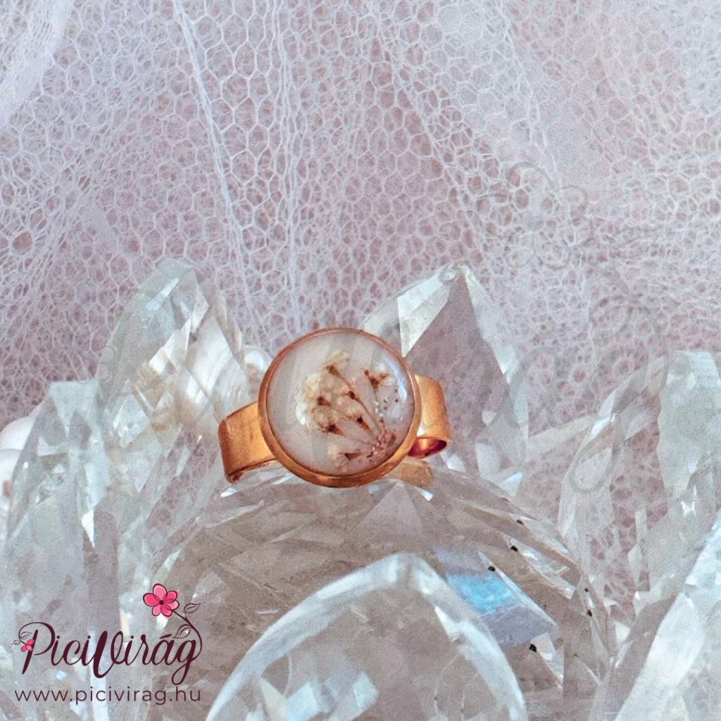 Az állítható méret kényelmes viseletet biztosít, míg az 1 cm-es tányér tökéletesen alkalmas aprólékos minták, anyatej vagy hajtincs megőrzésére. A Teljesség gyűrű arany ragyogása méltó keretet ad a legszemélyesebb emlékeknek.