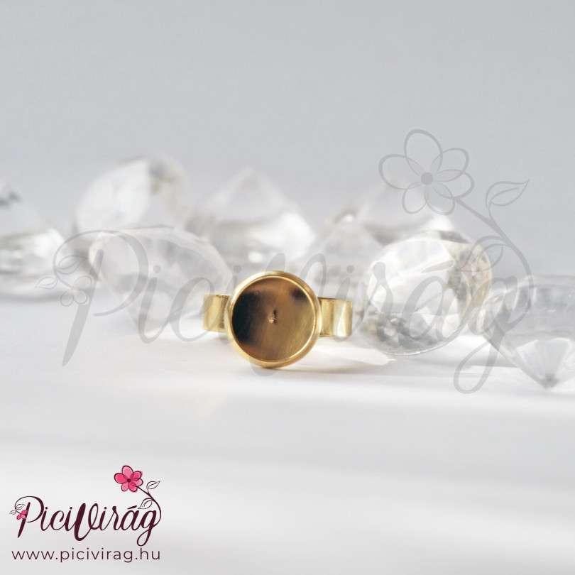Elegáns, állítható gyűrűalap arany színben, 1 cm-es tányérral. Fényes, nőies választás személyes emlékek megőrzéséhez.